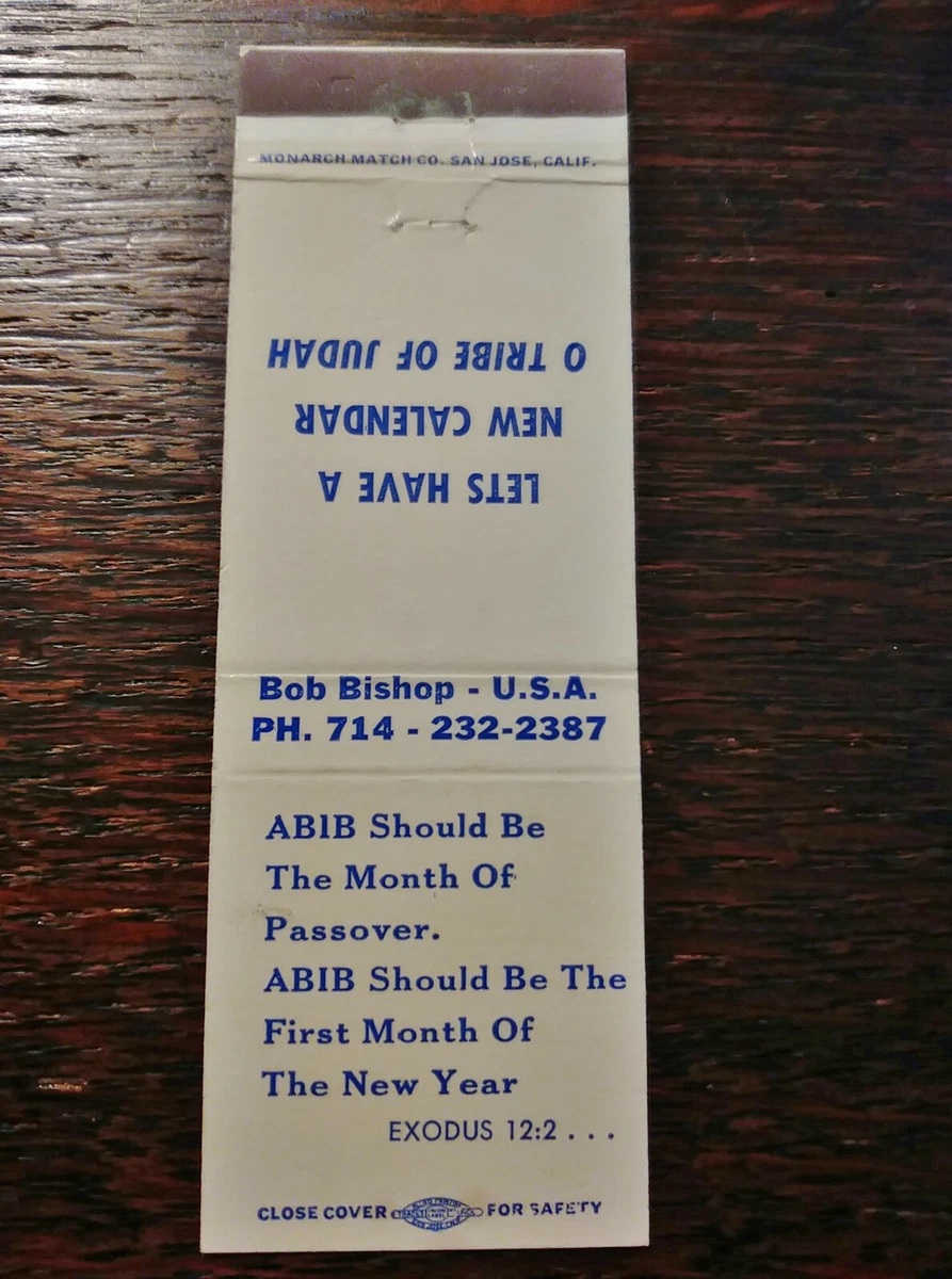 Vintage Matchcover: Bob Bishop, New Jewish Calendar, Abib, CA 29